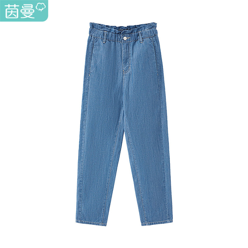 茵曼2021夏装新款女下装花苞腰头松紧腰设计感简约显瘦牛仔九分裤热门设计联盟服务商