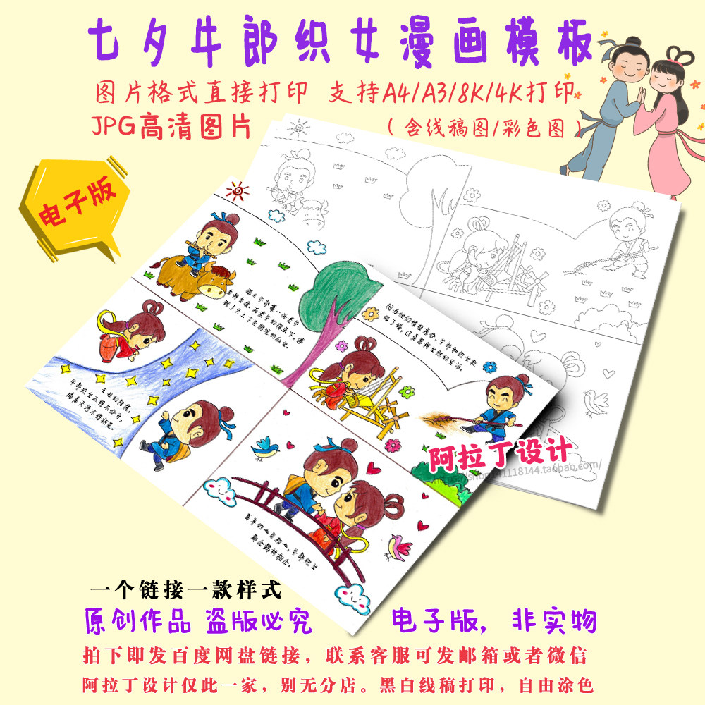 牛郎织女连环画七夕漫画学生七夕节手抄报黑白线描涂色电子简笔画热门设计联盟服务商